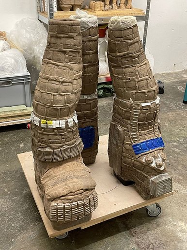Die Skulpturen von Ayaka Terajima verbinden die Ästhetik der aus der modernen Logistik-Philosophie hervorgegangenen, Zeit und Raum ordnenden Kunststoffverpackungen mit der reich verzierten Keramik der japanischen Jōmon-Periode (14000-1000 v. Chr.). Ihre Arbeiten stellt sie aus recyceltem Ton her, den sie selbst wiederverwertet. Die Technik dazu entwickelte sie in den vergangenen sechs Jahren. Dabei interessiert sich die in München lebende Künstlerin für die Bedeutung der symbolischen Verzierungen, die häufig auf prähistorischen Töpferwaren zu finden sind, sowie für Spiritualität, Rituale und archäologischen Materialien. Gleichzeitig ist für sie auch der Zustand der Materialität in unserer heutigen mechanisierten und digitalisierten Gesellschaft von Interesse, ebenso wie die Transformationsprozesse von Design und Materialität im Zuge von Logistik und Massenproduktion.